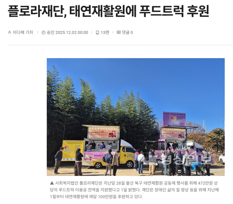 사회복지법인 플로라재단은 지난달 28일 울산 북구 태연재활원 공동체 행사를 위해 472만원 상당의 푸드트럭 이용료 전액을 지원했다고 1일 밝혔다. 재단은 장애인 삶의 질 향상 등을 위해 지난해 1월부터 태연재활원에 매달 100만원을 후원하고 있다.